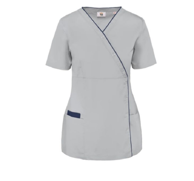 Blouse en 65% polyester / 35% coton. Tissu serg?. Coupe ajust?e gr?ce ? des pinces devant et dos pour une coupe plus f?minine. Encolure en V, Boutonnage asym?trique par bouton-pression. 2 poches avant dont une (? droite) ? double compartiments (poche int?rieure ? bord contrast?). Passepoil contrast? ? l’encolure et le long de la patte de fermeture. Tailles : XS ? 3XL. Coloris : snow grey.
