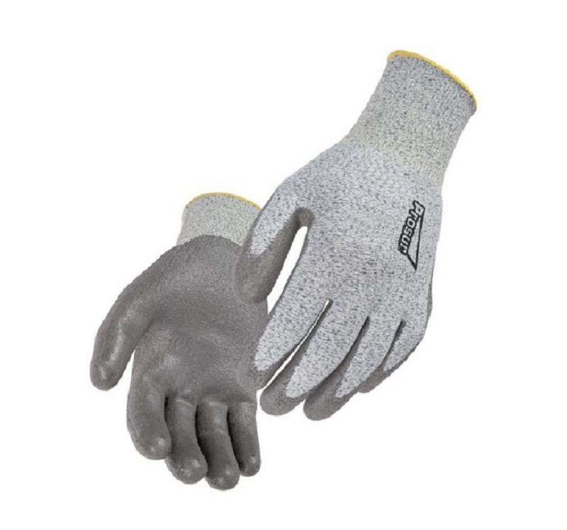 Gants anticoupure niveau D. Montage tricot? une pi?ce (sans couture). Jauge 13. Support en fibres haute t?nacit? PEHD. Enduction souple polyur?thane (PU) sur la paume. Dos a?r?. Poignet ?lastique. Coloris gris. Dext?rit?: niveau de performance 5. Tailles : 6 ? 11.