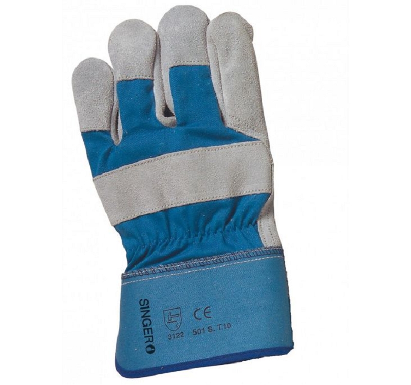 Gants de manutention lourde en croûte de bovin. Paume doubl?e coton. Onglets cuir. Dos et manchette toile coton coloris bleu. Manchette caoutchout?e. Onglets et barre de renfort aux articulations en cuir. Serrage ?lastique au dos. Mod?le type docker, montage type am?ricain. Taille 10. EN 420 – EN 388 (3.1.2.2)