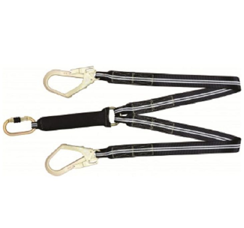 Longe fourche en sangle avec absorbeur d’?nergie con?u pour les travaux en hauteur de soudeur. Larg. 44 mm afin d’avoir un impact en cas de chute < ? 6 kN - Sangle aramide larg. 45 mm - Absorbeur prot?g? par un tissu non feu. 2 mousquetons ? fermeture et verrouillage auto. double action, ouverture 55 mm et 1 mousqueton ouverture 17 mm, ? verrouill. ? vis. EN 355 : 2002 ISO 9150 : 1988 et ISO 15025 : 2005 Long. = 1m (connecteurs compris). Existe aussi en 1,5m.