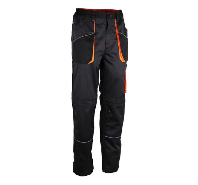 Pantalon de travail en 65% polyester/35% coton, 245 gr/m?. Emplacements pour genouill?res. Elastique ? la taille. Nombreuses poches fonctionnelles dont une poche t?l?phone. Tailles S ? 3XL. Coloris gris anthracite/noir contrastes orange.