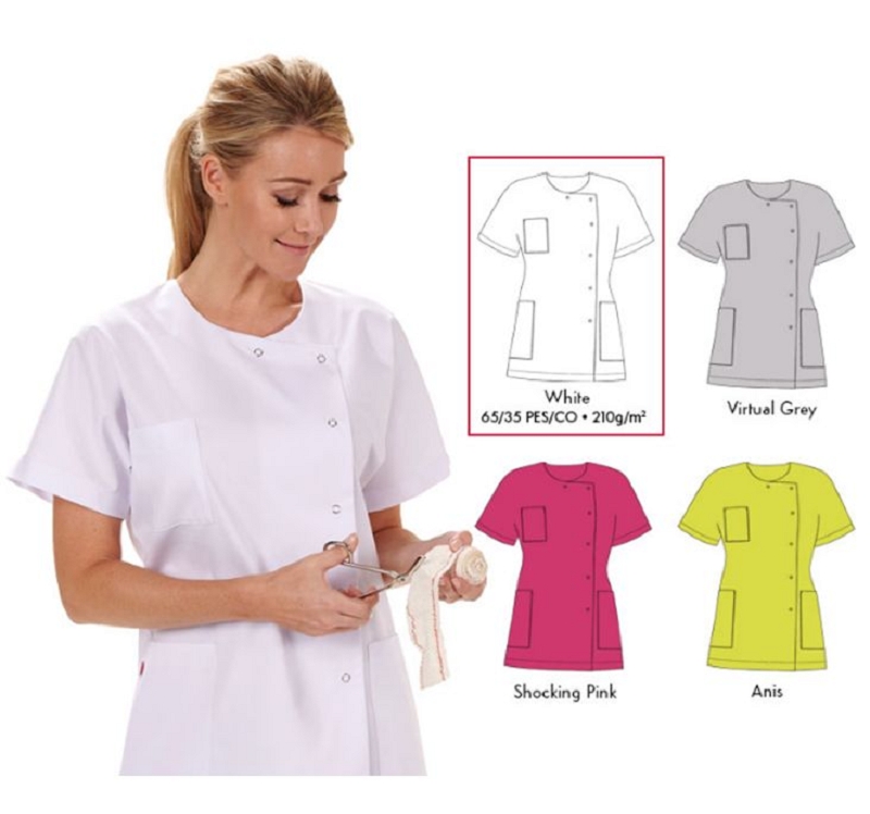 Tunique dame. Fermeture par pressions. Manches kimono. Poche poitrine. Poches c?t?. Longueur : 75 cm. Coloris : anis, shocking pink, virtual grey, white. Tailles : XXS ? XXL.